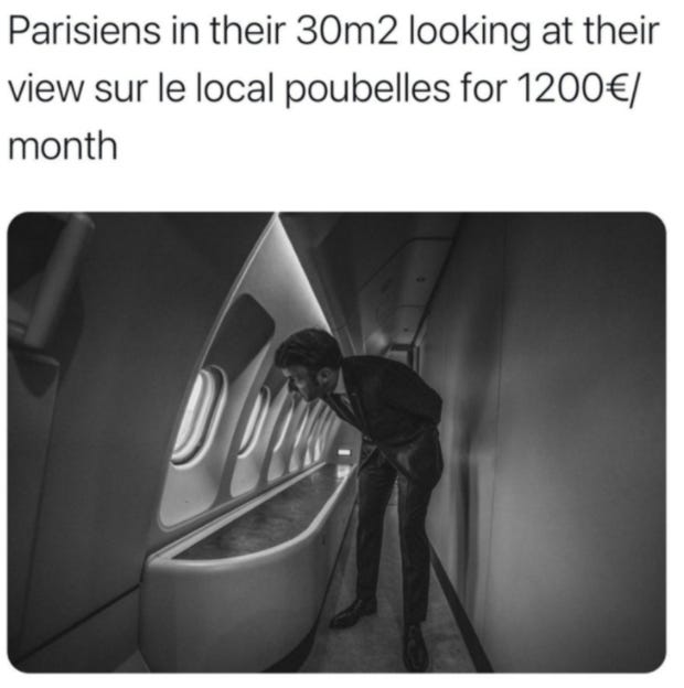 Until then, I leave you with this meme I came across. It speaks about the process of finding a nice flat to live in in Paris. The caption reads: ‘Parisians in their studio flats looking out at their view over the bins for 1200 euros a month’.
